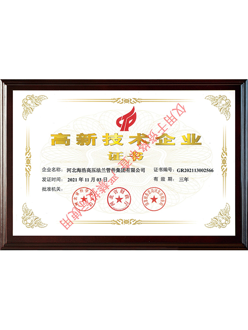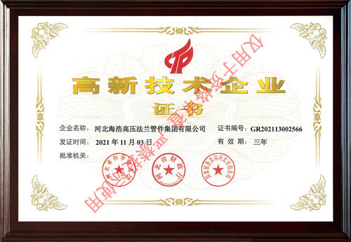 河北海浩高壓法蘭管件集團有限公司榮獲“高新技術企業”稱號