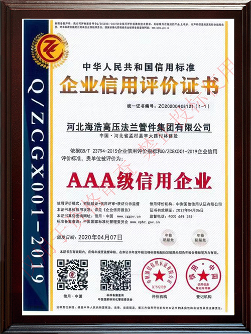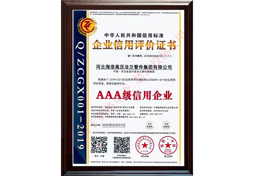 河北海浩高壓法蘭管件集團有限公司榮獲“AAA-信用證書”