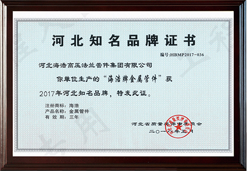 河北海浩高壓法蘭管件集團有限公司榮獲“河北知名品牌”證書
